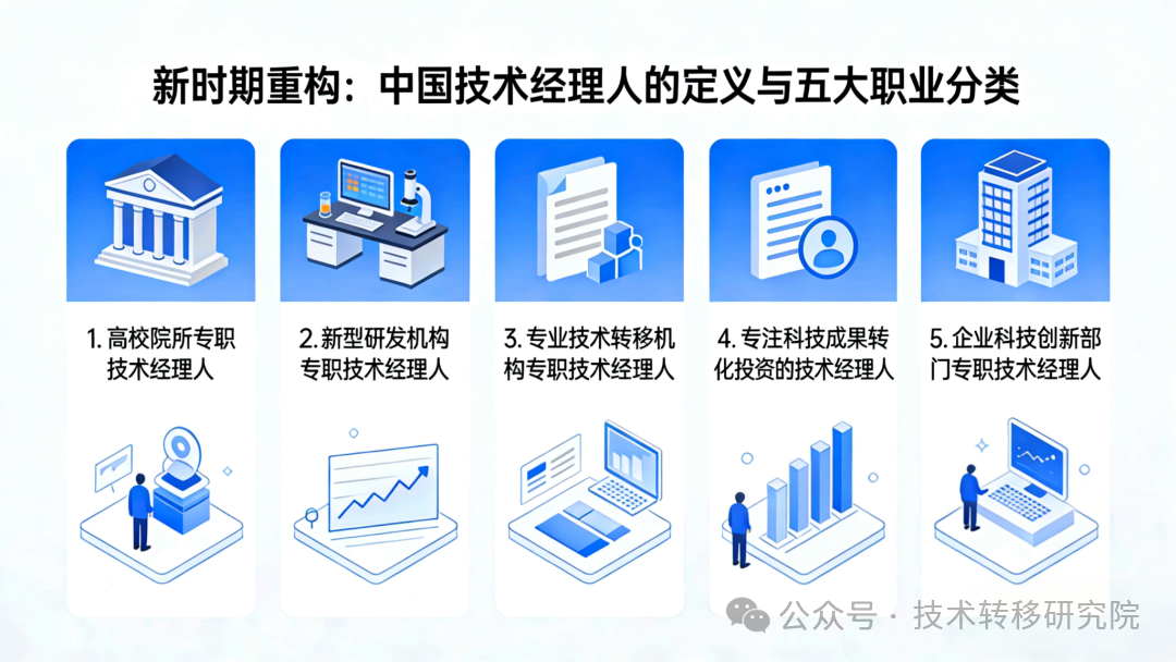 基于中国科创体系的独特结构、成果转化的全链条分工,当前我国执业的技术经理人,可清晰划分为五大类,五大群体各司其职、互补共生,共同构成了中国特色技术经理人的完整生态。